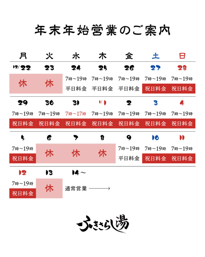 ふきさらし湯では、年末年始の営業日が決まりました。